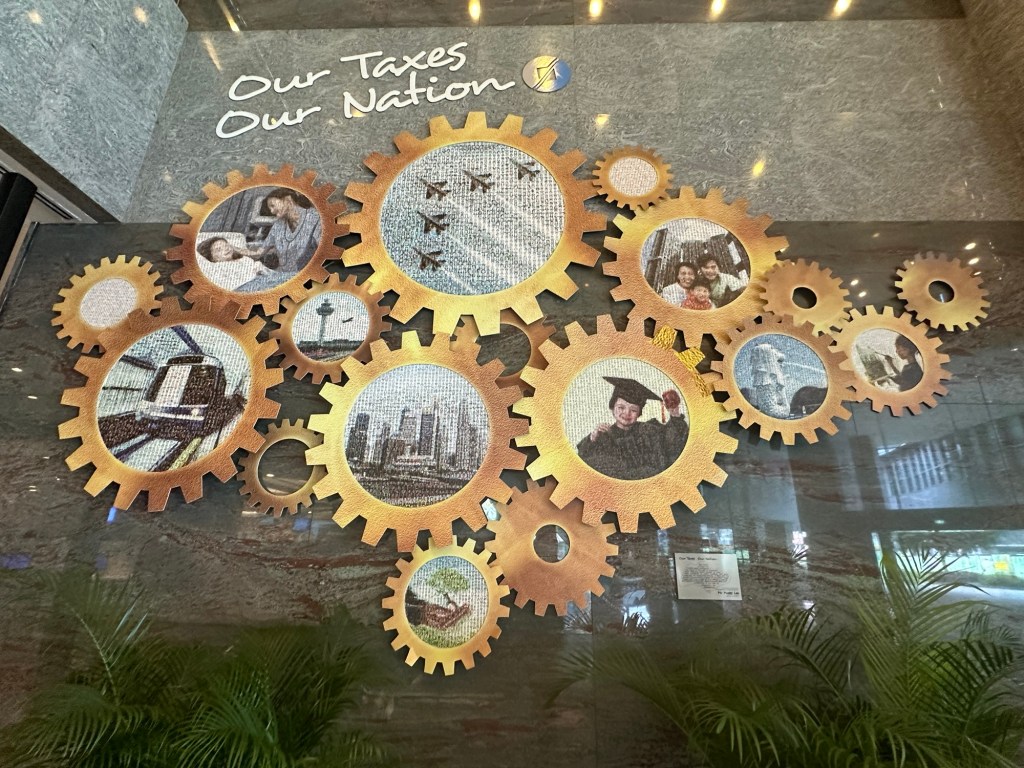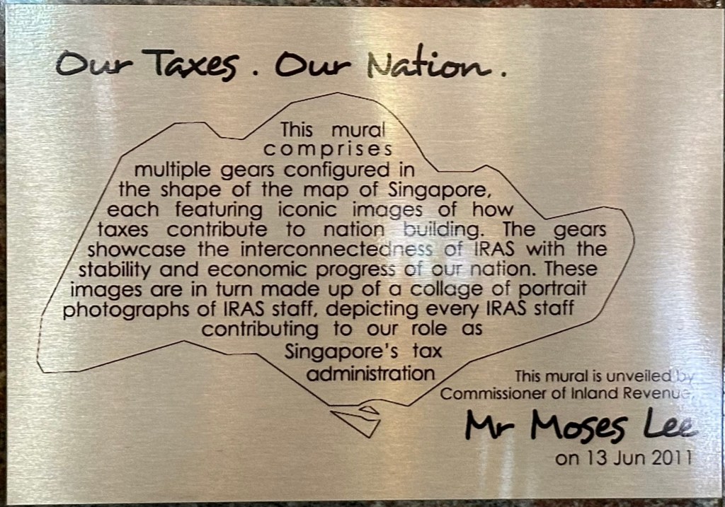 This mural comprises multiple gears configured in the shape of the map of Singapore, each featuring iconic images of how taxes contribute to nation building. The gears showcase the interconnectedness of IRAS with the stability and economic progress of our nation. These images are in turn made up of a collage of portraits photographs of IRAS officers, depicting every IRAS staff contributing to our role as Singapore’s tax administration.